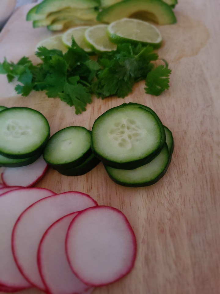 2. Use the remaining half of the avocado wedges from other half of avocado as topping or garnish with the cucumbers, radishes and cilantro if you wish.